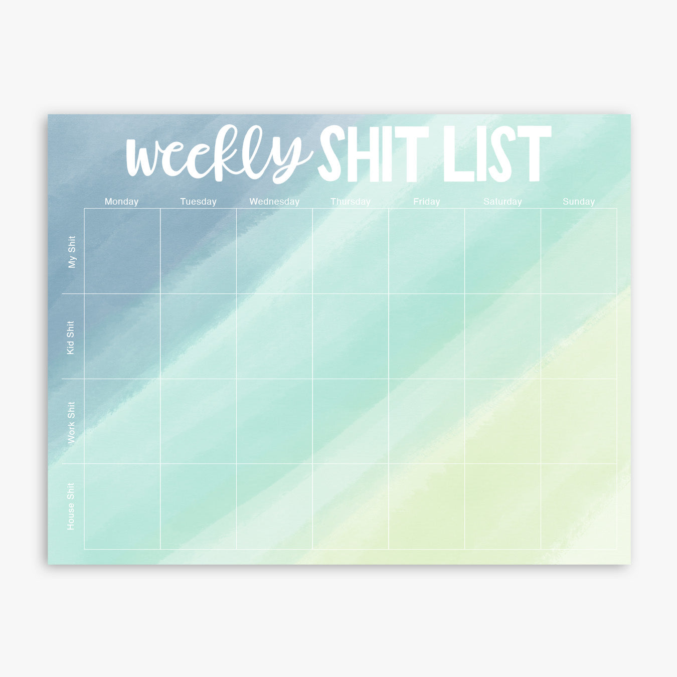 Each day is divided into four sections labeled My Shit, Kid Shit, Work Shit, House Shit